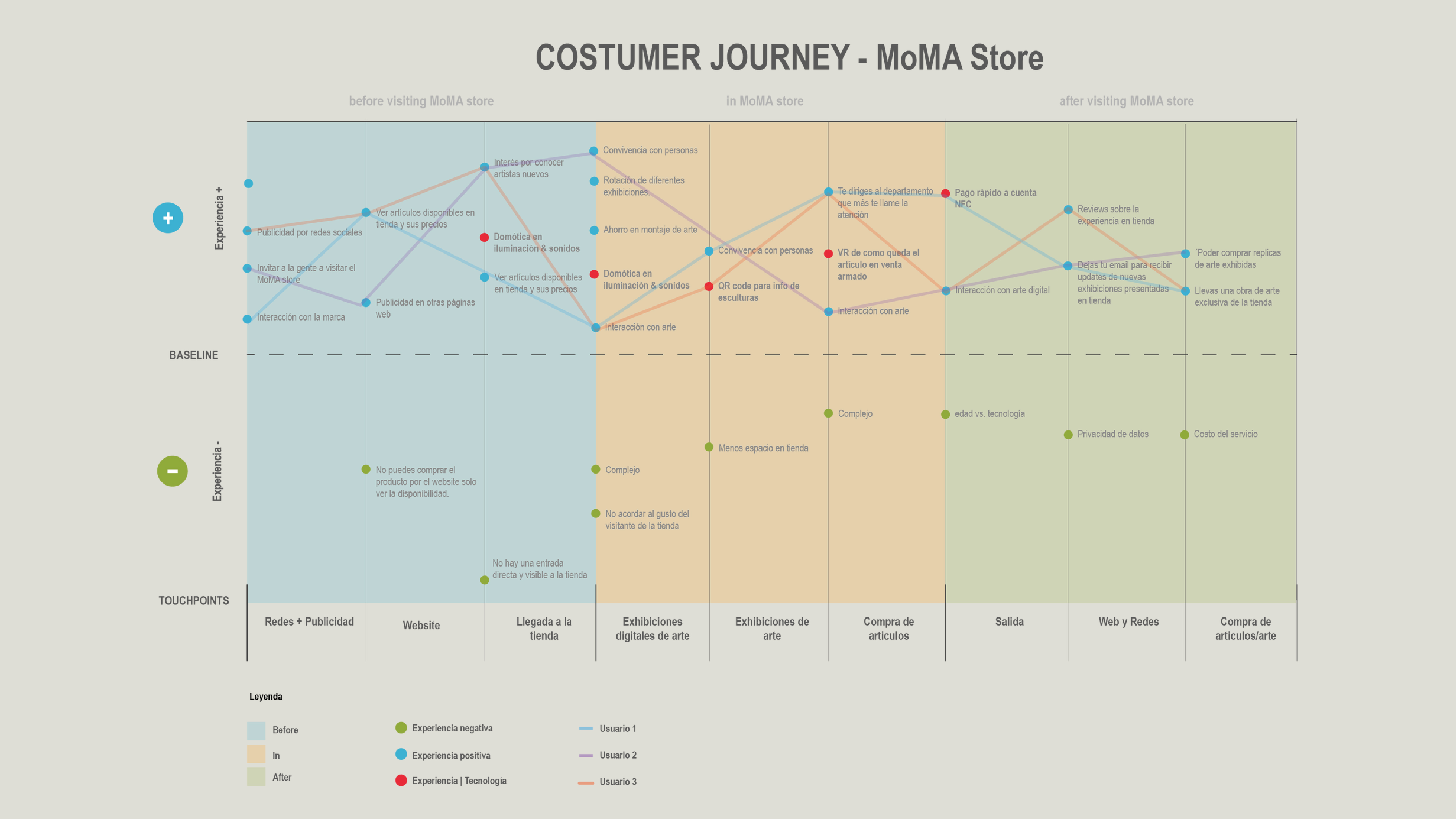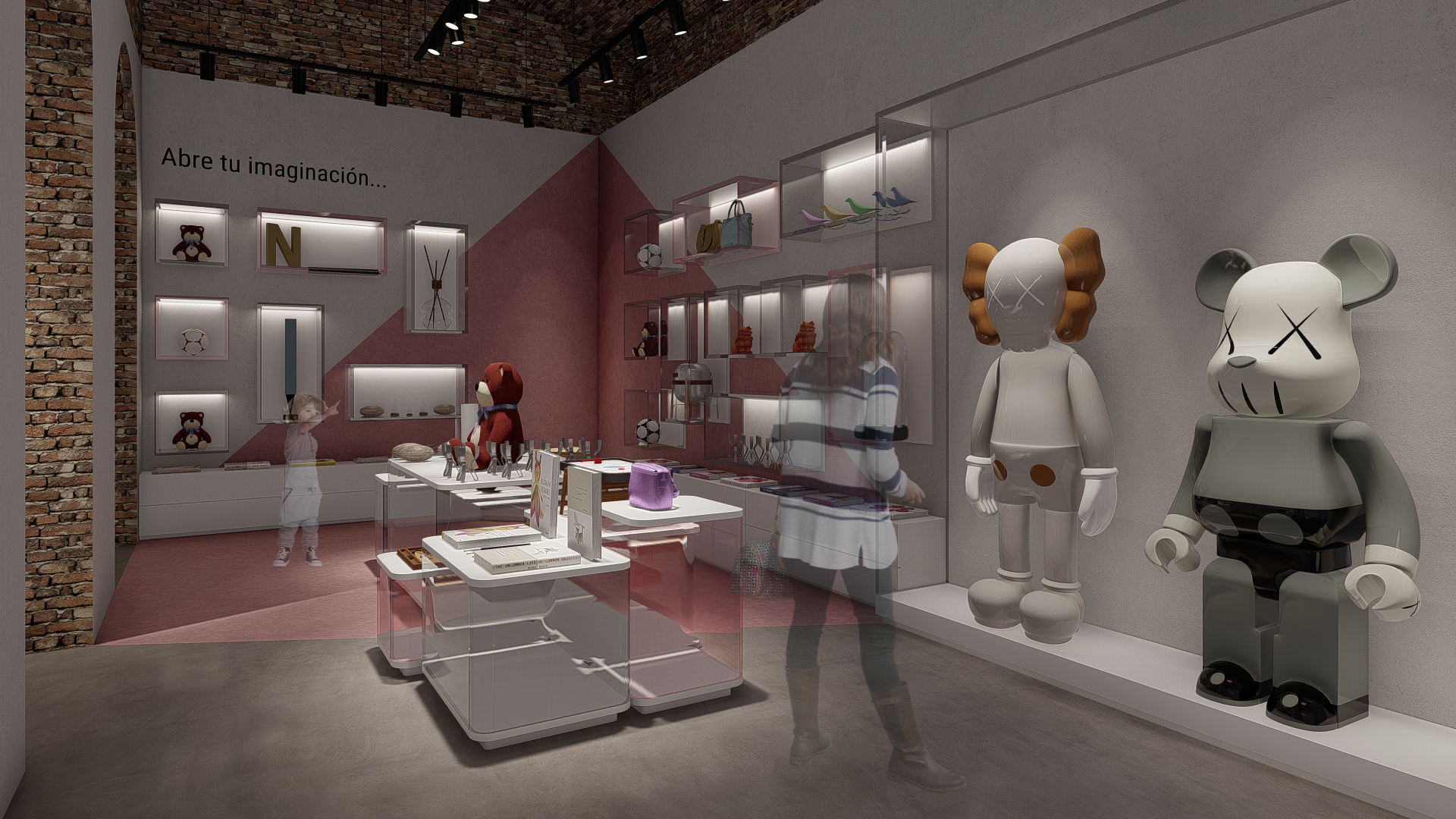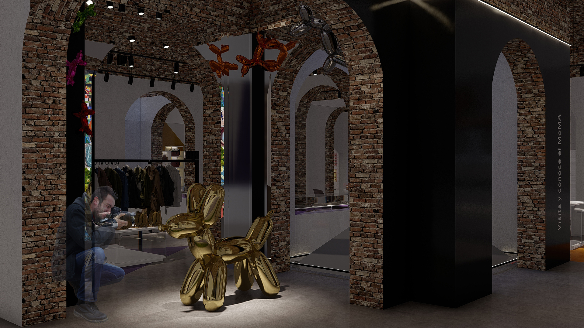 Se destaca el acceso a la tienda a través de una instalación lumínica que genera contraste entre el exterior y el interior de la misma, el uso de colores para la zonificación de las diferentes áreas de productos y actividades. Y la creación de áreas interactivas para los usuarios: pasillo de pantallas cambiantes con el arte exhibido actualmente en el museo de NYC, un área de exhibición de arte en colaboración de un artista y por último, un espacio para compra y personalización de un producto de la tienda.
