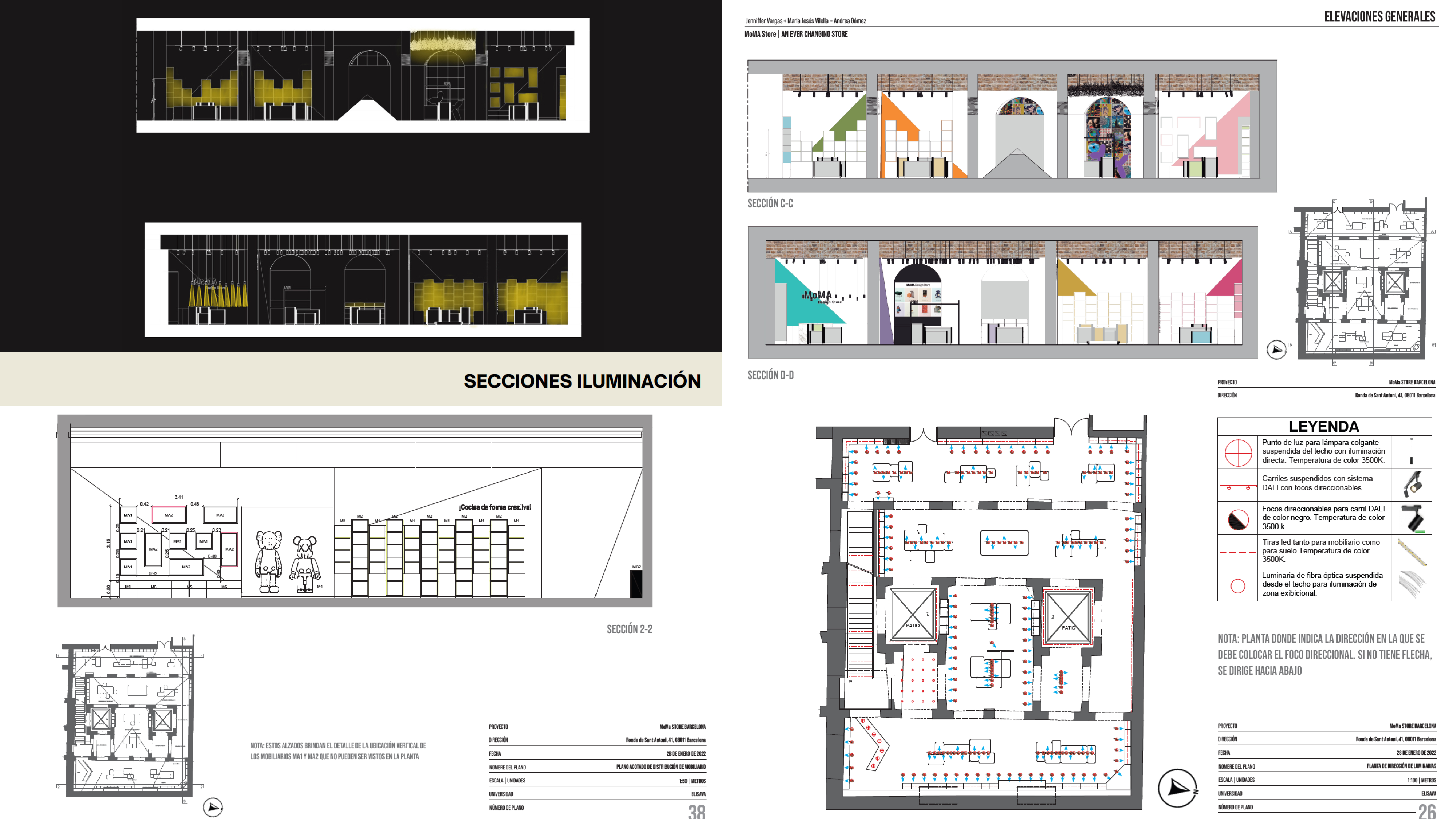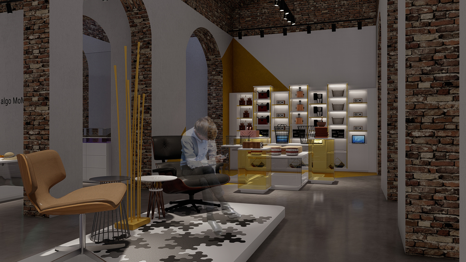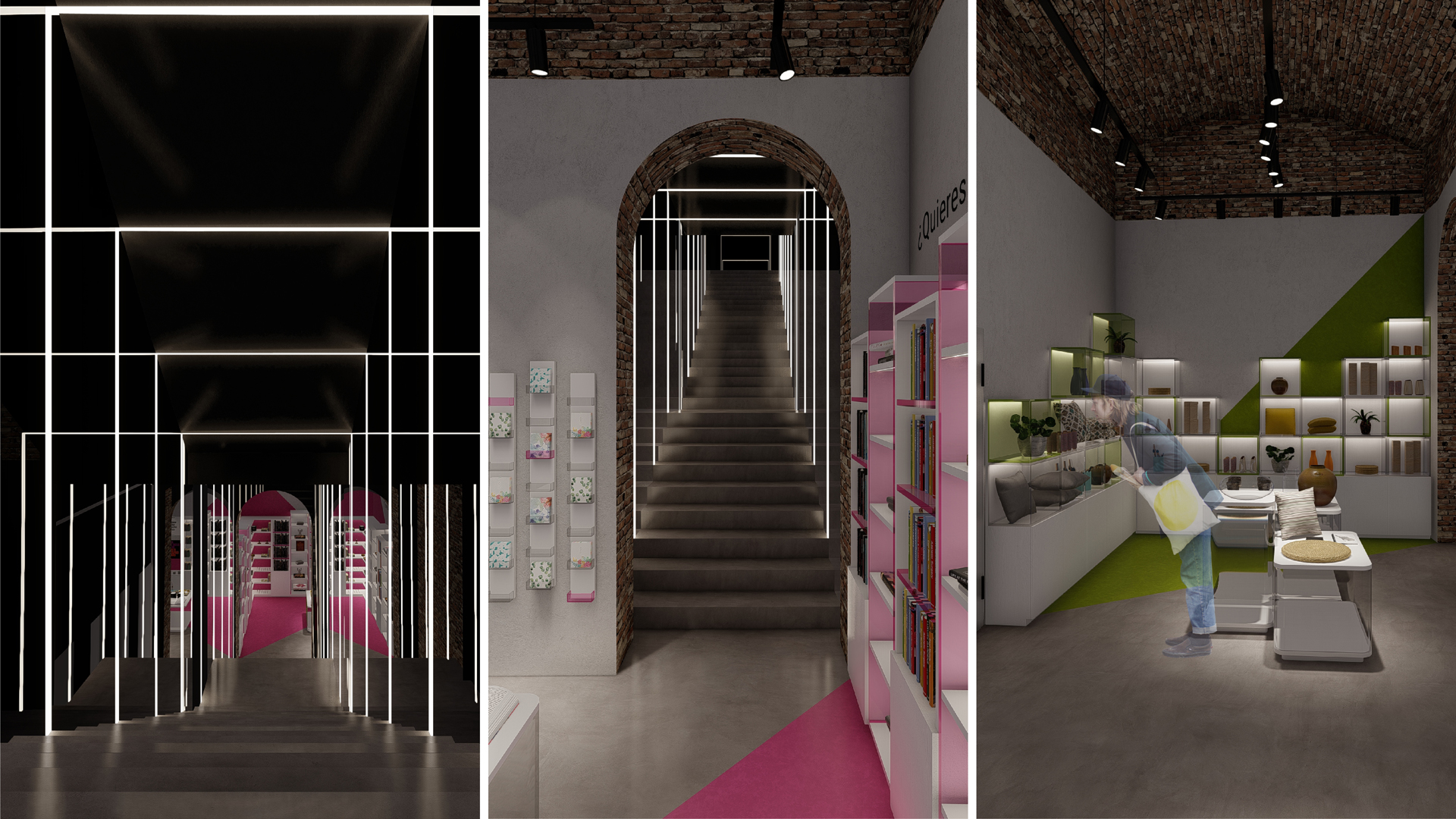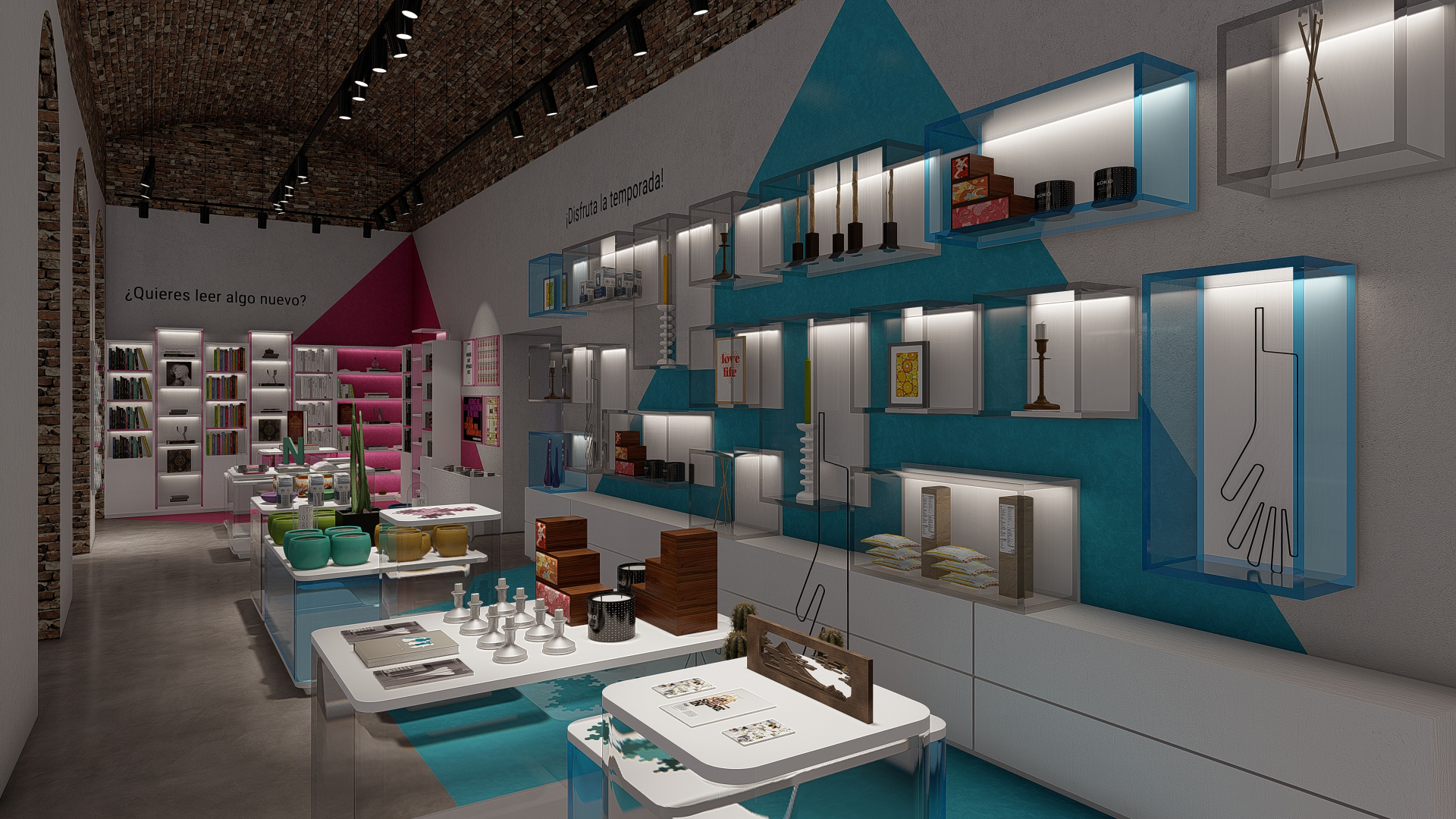 Se destaca el acceso a la tienda a través de una instalación lumínica que genera contraste entre el exterior y el interior de la misma, el uso de colores para la zonificación de las diferentes áreas de productos y actividades. Y la creación de áreas interactivas para los usuarios: pasillo de pantallas cambiantes con el arte exhibido actualmente en el museo de NYC, un área de exhibición de arte en colaboración de un artista y por último, un espacio para compra y personalización de un producto de la tienda.