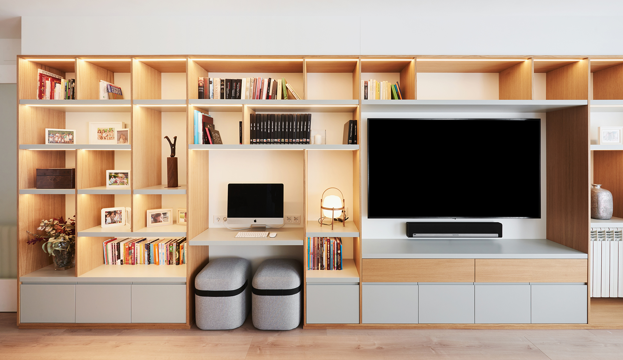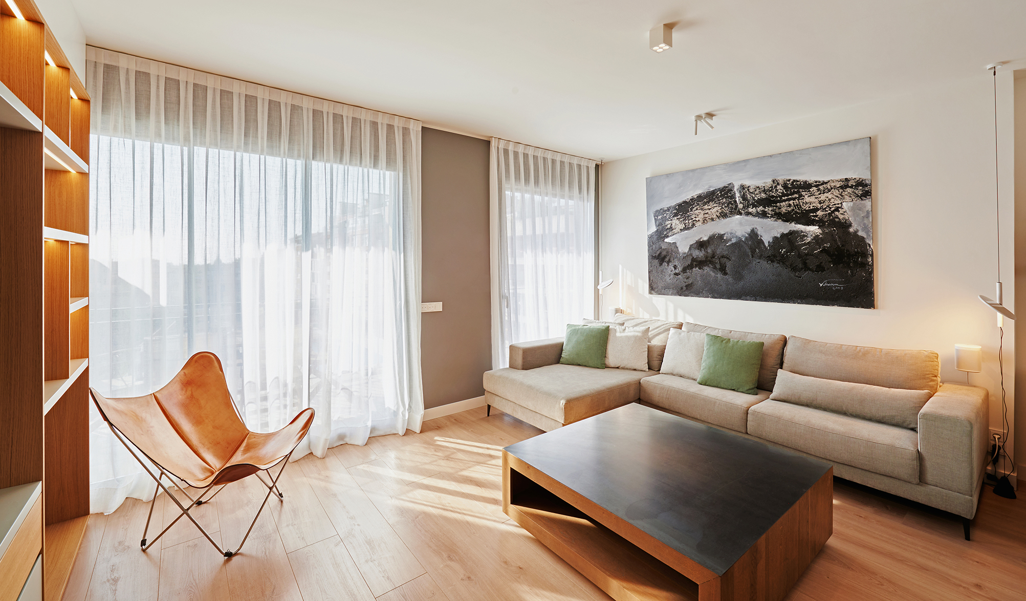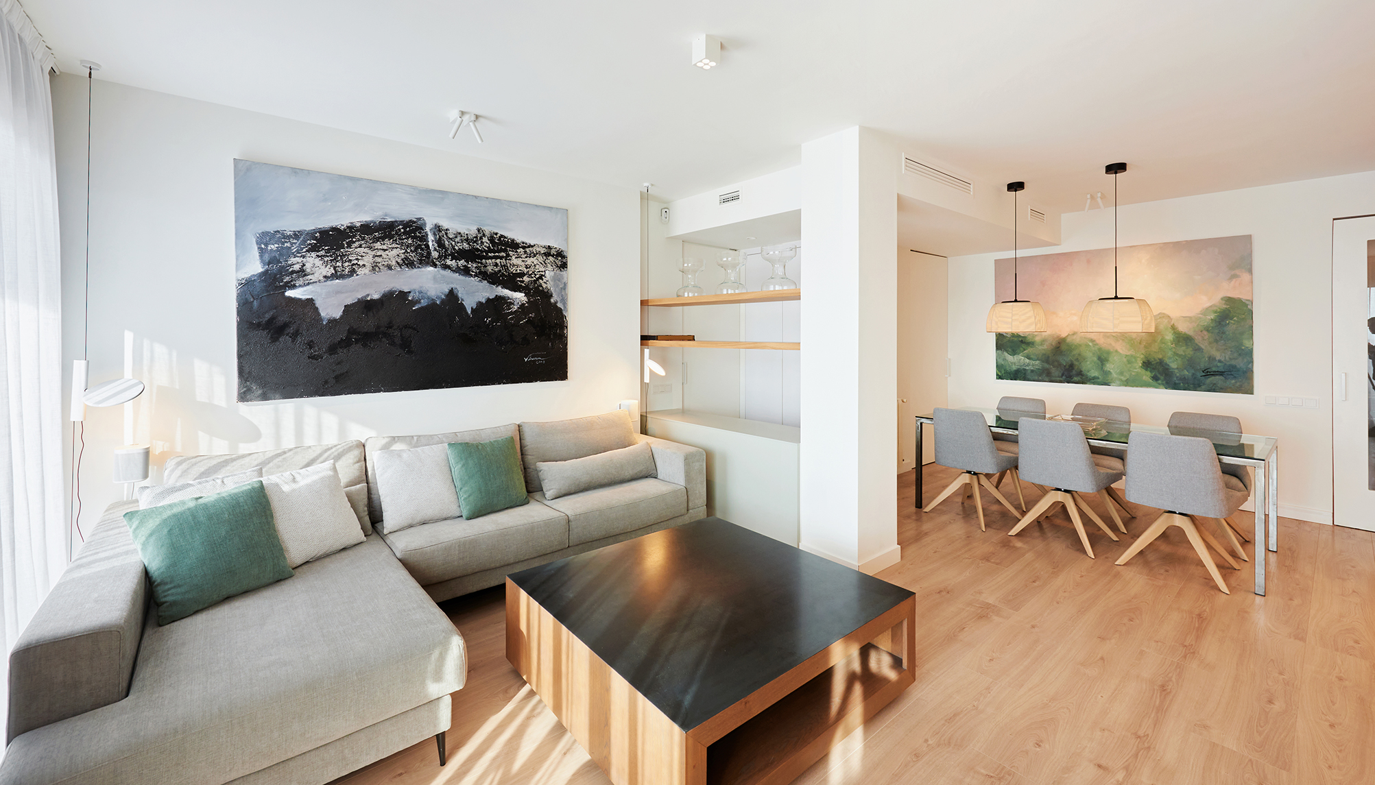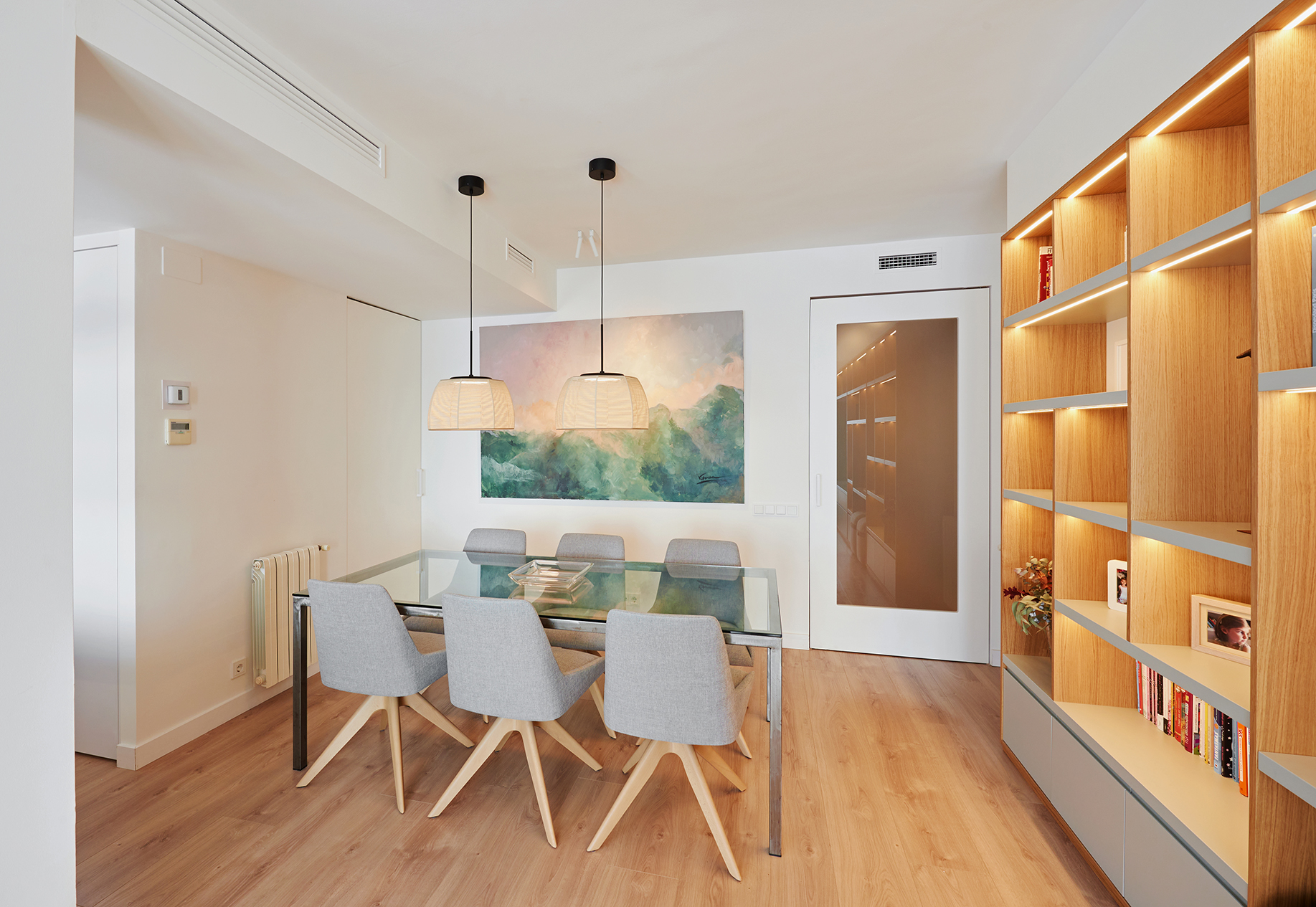 La reforma de interiorismo de las zonas comunes de este piso (salón, comedor y despacho), se enfocó en crear un ambiente multifuncional que combinara el trabajo y descanso, manteniendo al mismo tiempo un toque acogedor y decorativo. Para lograr esta versatilidad, se diseñó una distribución abierta y fluida que permitiera la interconexión entre los espacios. Se utilizaron colores cálidos y tonos neutros.
