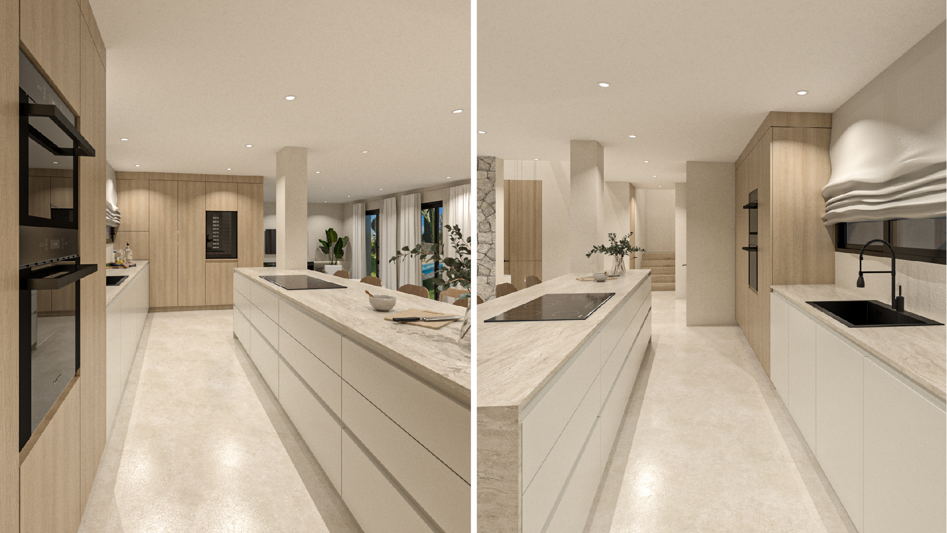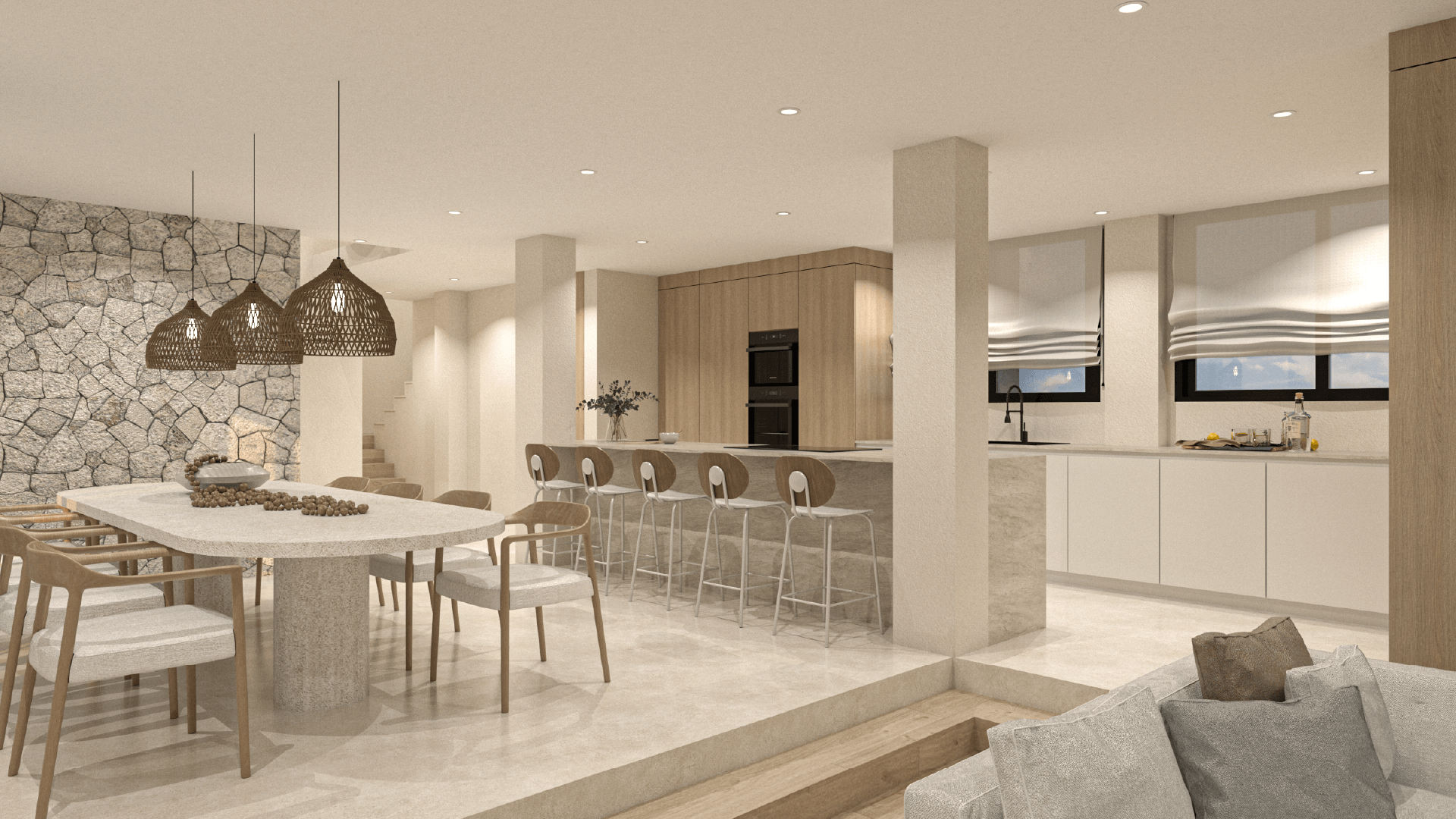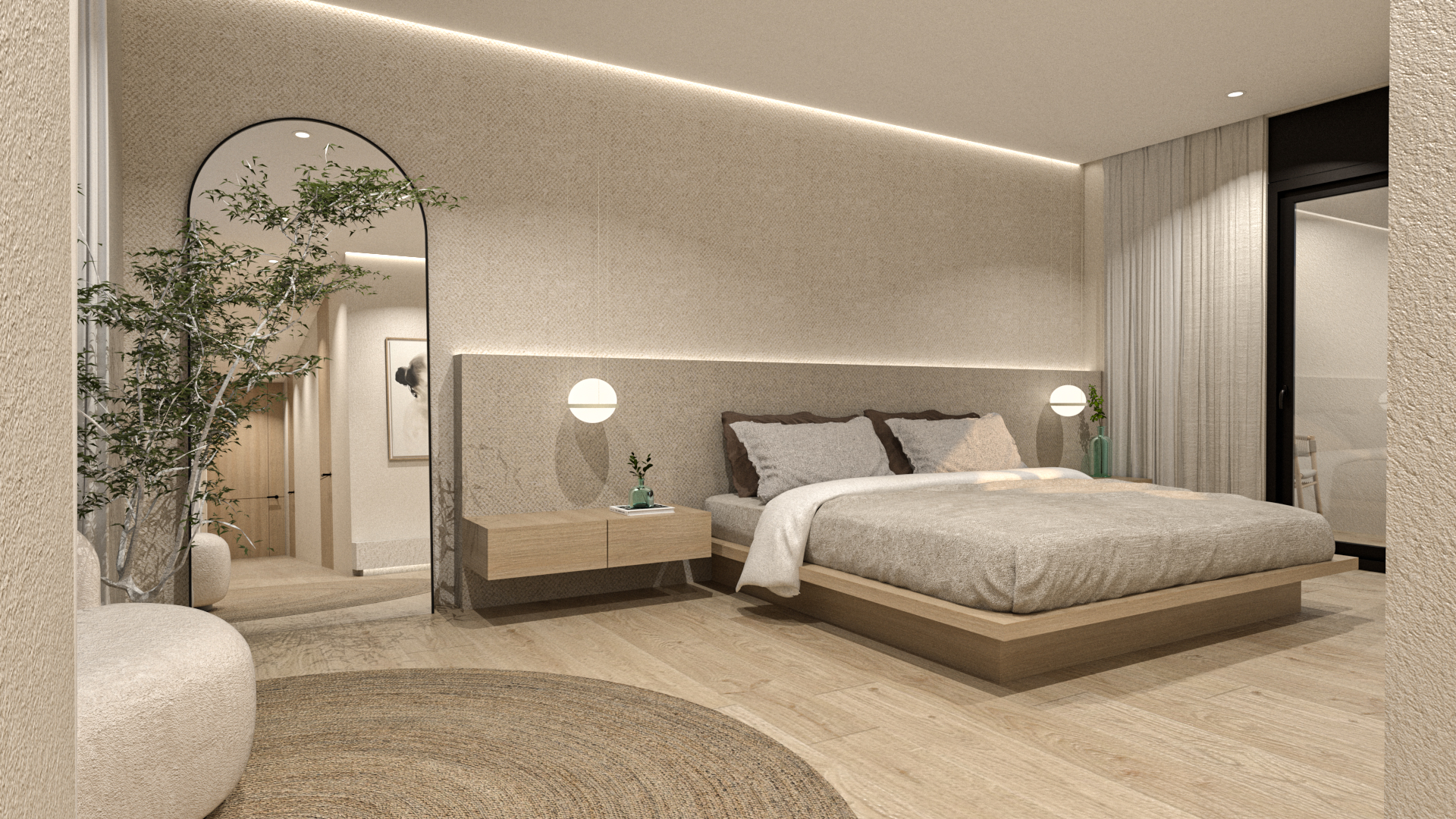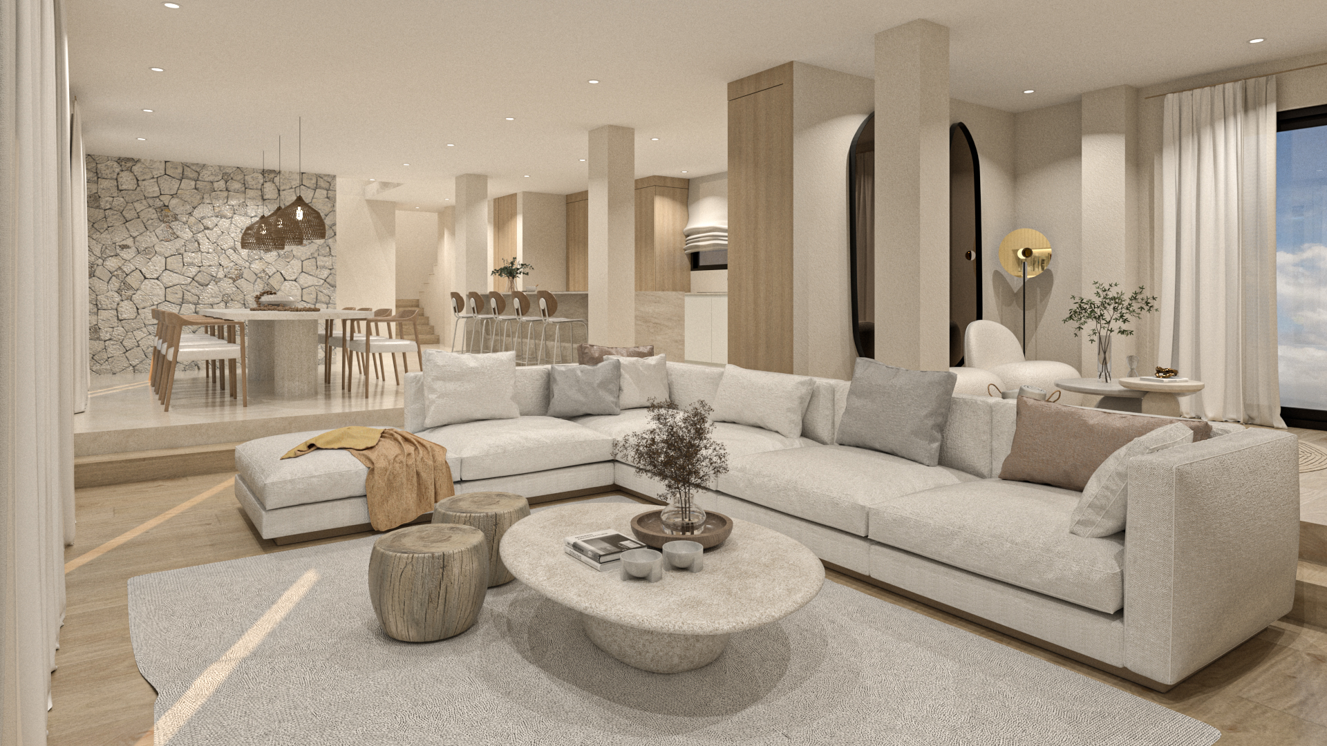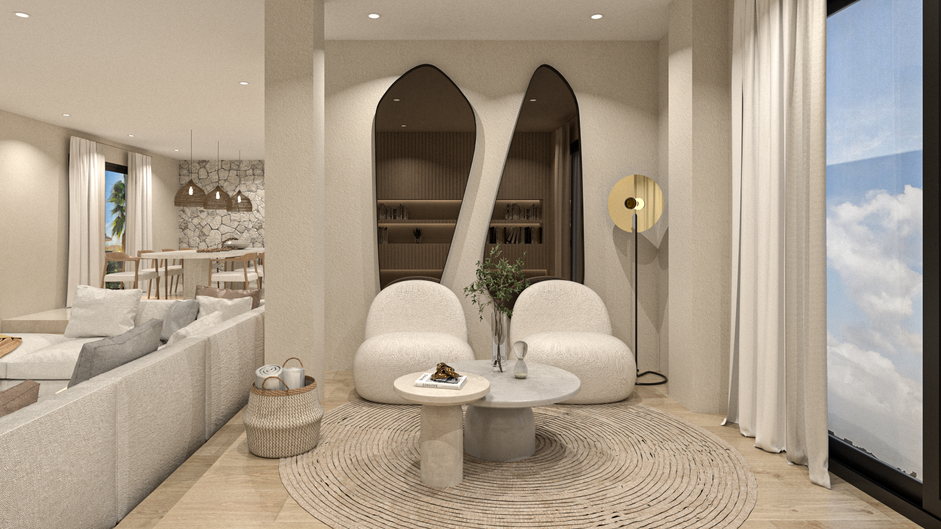 La paleta de colores se centra en el blanco y colores nude, mientras que los tejidos suaves aportan calidez al ambiente. El diseño busca crear un espacio armonioso y sereno, donde la simplicidad y la elegancia se funcionen para realzar la belleza de los elementos claves del hogar, mientras se maximiza el espacio y la funcionalidad. El resultado final es un hogar contemporáneo que se integra armoniosamente con el entorno natural circundante.