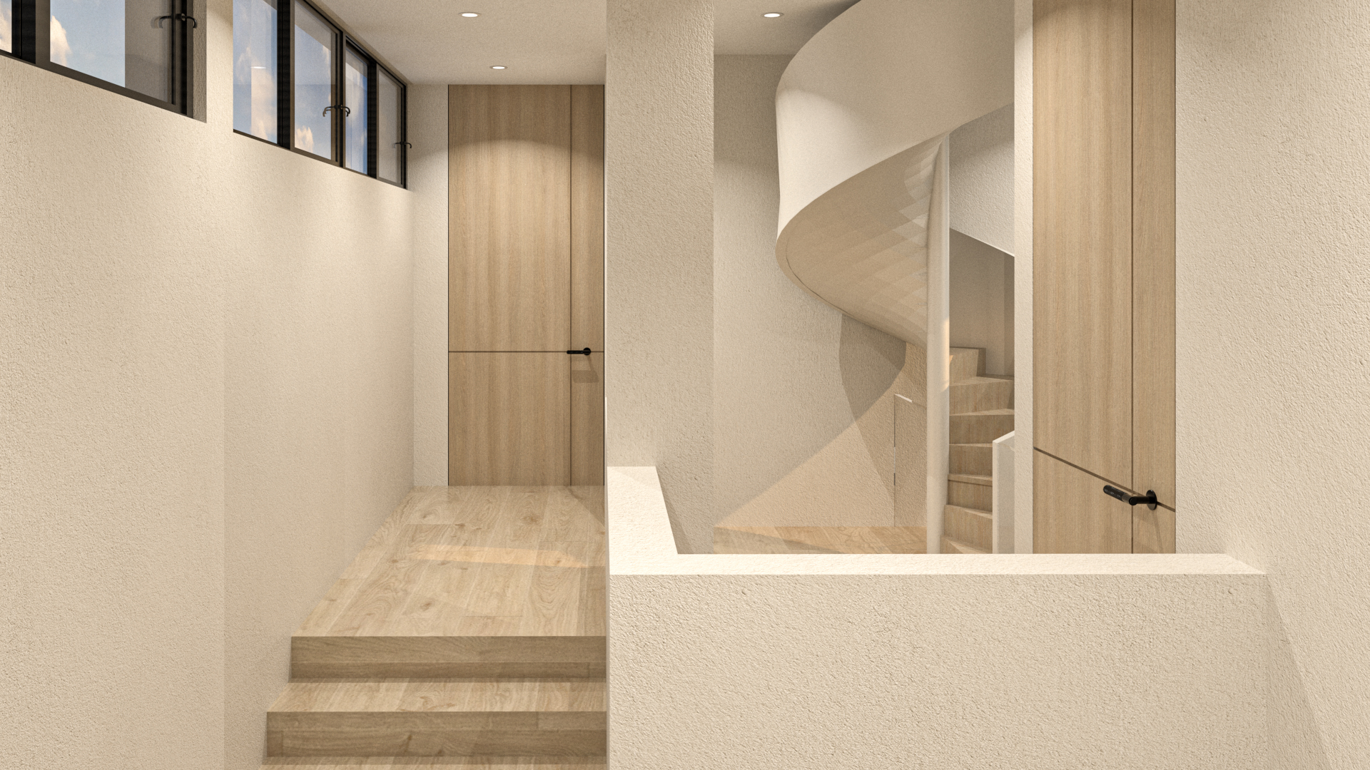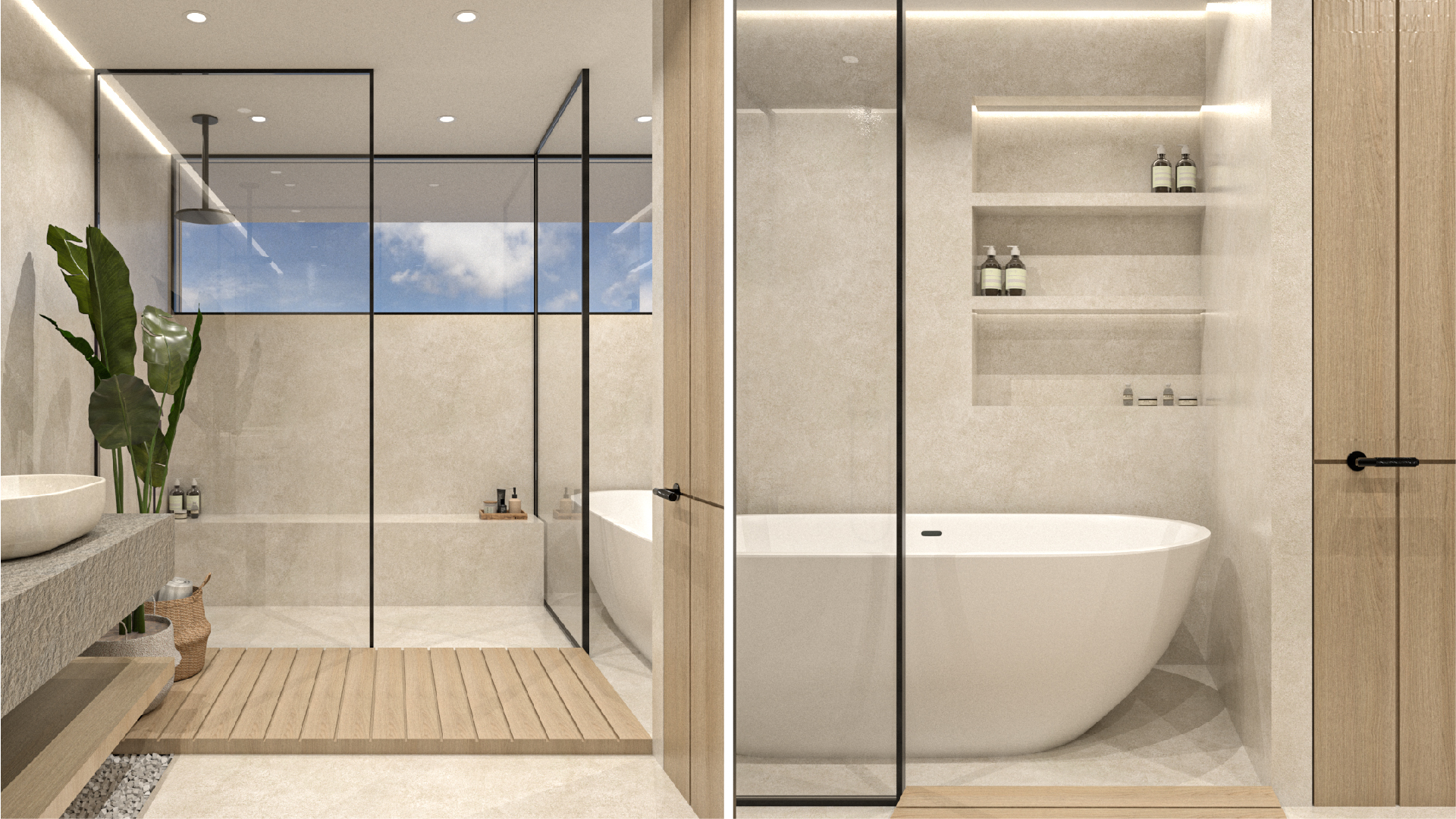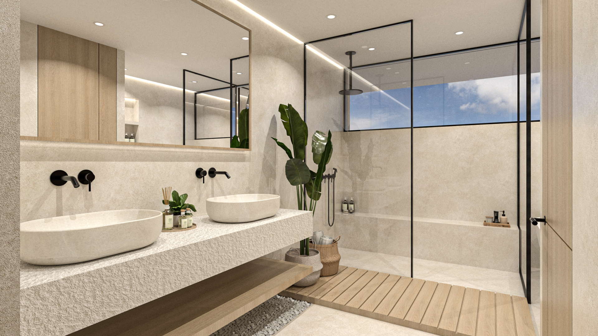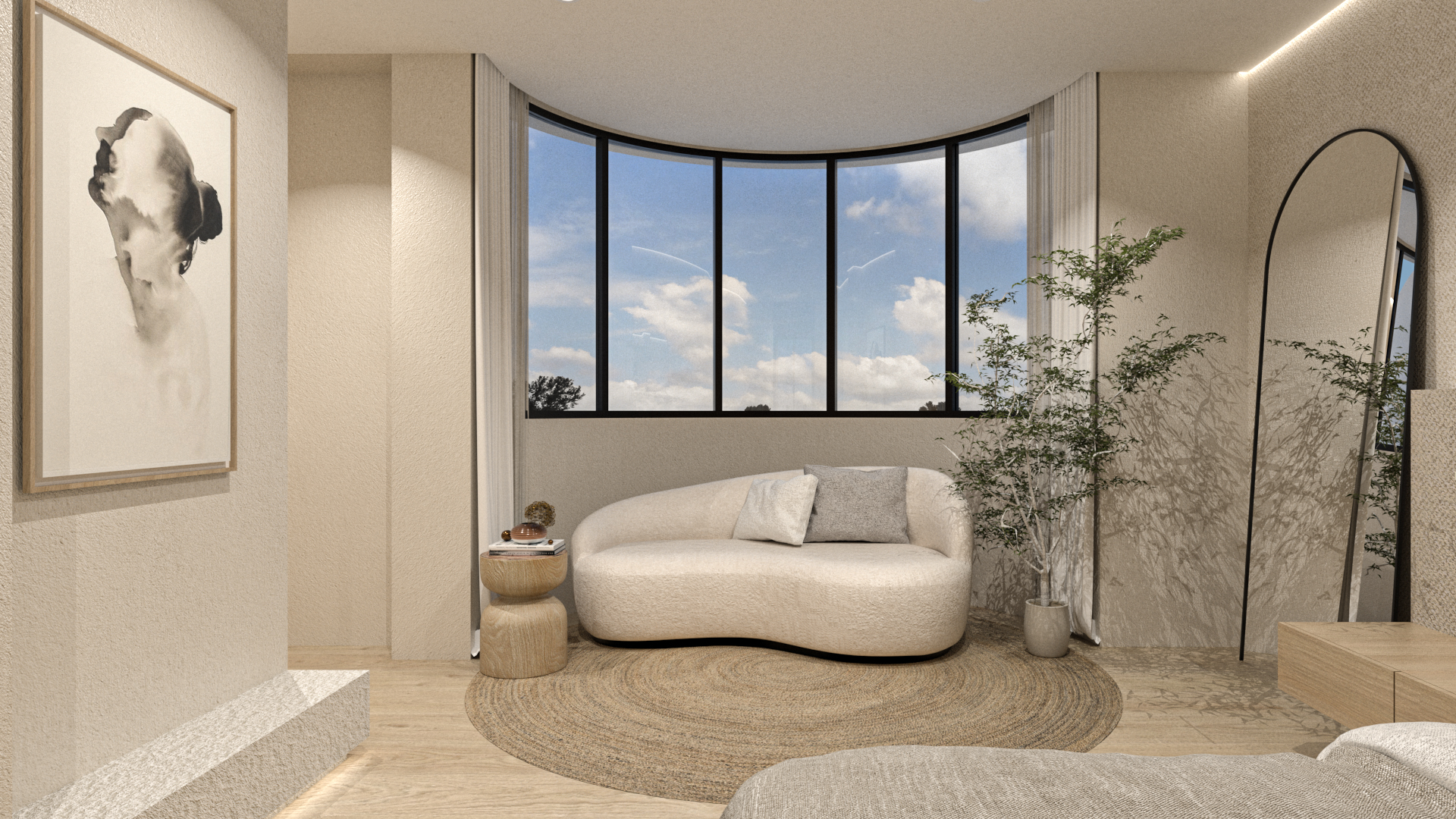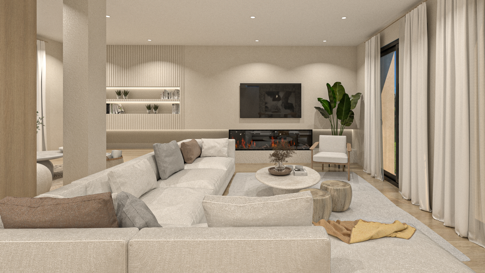 La paleta de colores se centra en el blanco y colores nude, mientras que los tejidos suaves aportan calidez al ambiente. El diseño busca crear un espacio armonioso y sereno, donde la simplicidad y la elegancia se funcionen para realzar la belleza de los elementos claves del hogar, mientras se maximiza el espacio y la funcionalidad. El resultado final es un hogar contemporáneo que se integra armoniosamente con el entorno natural circundante.